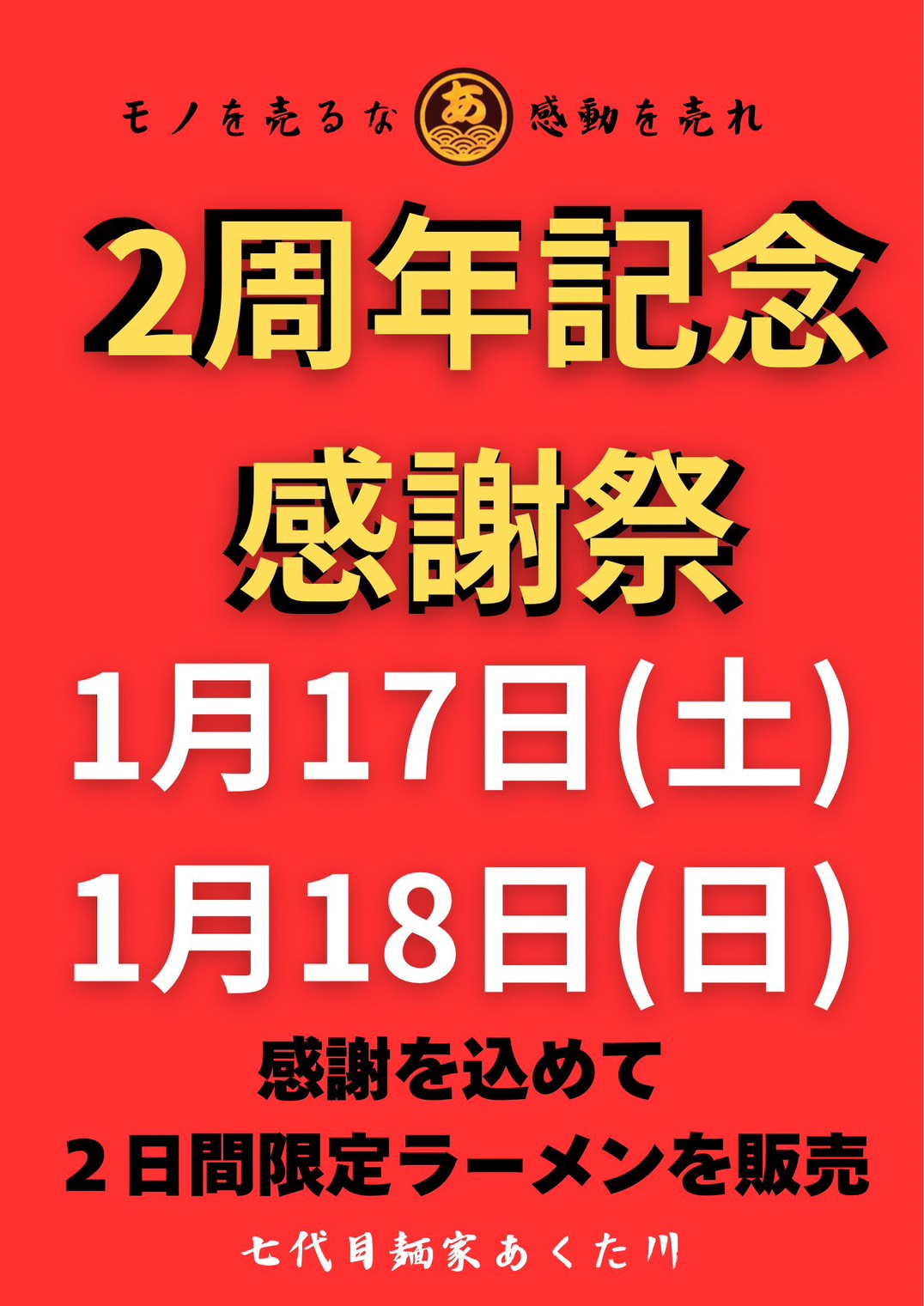 この信念を掲げて走り続け、おかげさまで「七代目 麺家あくた川」は2周年を迎えることができました!皆さまへの感謝をカタチにするべく、特別な感謝祭を執筆いたします。 【開催日】 1月17日(土)・18日(日) 【イベント目玉 […]